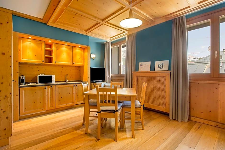 This apartment has a mountain view, a living room with sofa bed and kitchenette. The room is without air conditioning. The 1224 Bar Lounge & Terrace, The Savoy Restaurant, Breakfast room, Grand Hotel Savoia Spa, Skiroom, KidsClub and Service Parking are physically located in the Grand Hotel Savoia, just across the Residence Savoia Palace Street.