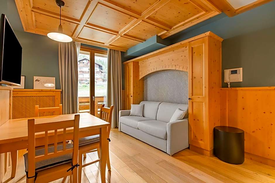 The apartment features a living room with a sofa bed and a kitchenette. Please note that the room is not equipped with air conditioning. The following amenities are available at the Grand Hotel Savoia, located directly across the street from Residence Savoia Palace: 1224 Bar Lounge & Terrace, The Savoy Restaurant, Breakfast Room, Grand Hotel Savoia Spa, Ski Room, Kids Club, and Service Parking